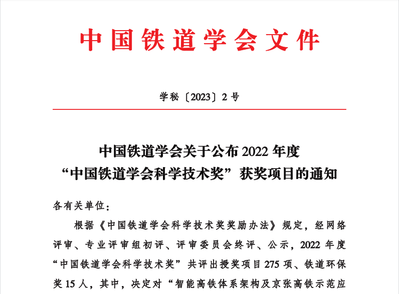 中国铁道学会科学技术奖于2002年3月正式设立,旨在对在中国铁道行业科技活动中做出突出贡献的单位和个人进行表彰,以提高铁路技术创新能力,加速铁路现代化建设。2022年度“中国铁道学会科学技术奖” 共评出授奖项目275项。